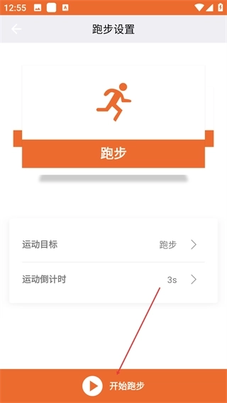 2、进入【跑步设置】页面后,能够对【运动目标-跑步】以及【运动倒计时-3s】进行配置,完成确认操作后,点击【开始跑步】即可启动运动记录功能。