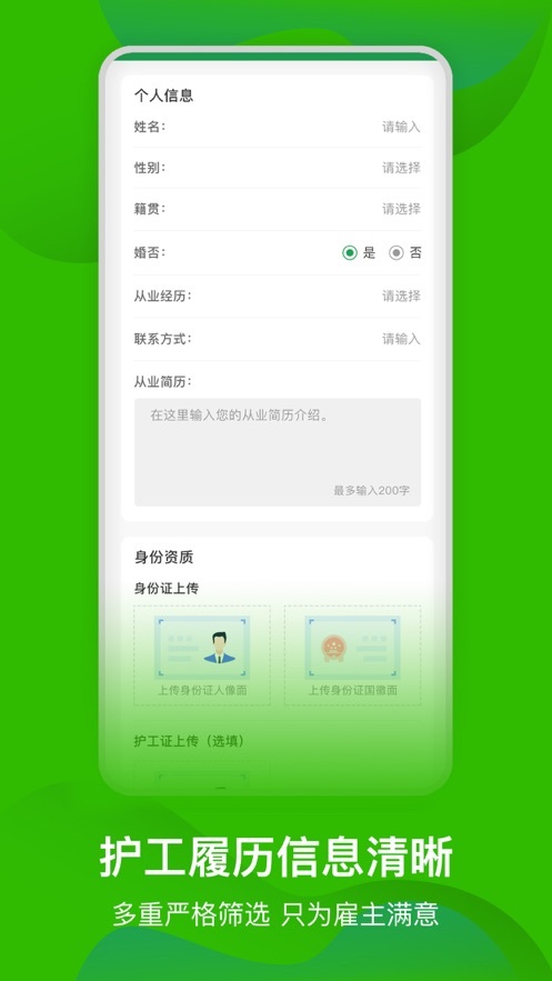 2. 深入了解护工:应用程序会展示护工的个人资料与资质文件,用户能够借助该应用程序知晓护工的具体信息,像教育经历、从业经验、技能资质证书等内容。