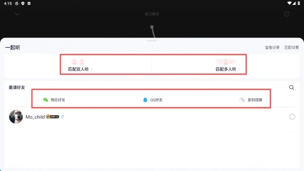 5、支持随机匹配共同聆听,也能通过微信、QQ或复制链接这三种途径分享给好友,好友点击邀请就能一同欣赏音乐了。