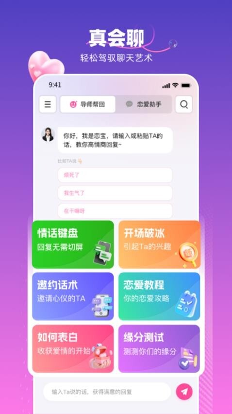 真会聊高情商聊天回复神器是一款辅助工具,主要目的是帮助用户提升聊天技巧、增强情商。它能提供智能回复建议和情商培养策略,让用户在各类社交场合中,与他人交流时能更自信、得体。