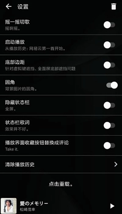 4、进入设置页面后,用户也能尝试开启“摇一摇切歌”“状态栏歌词”“底部边距”等功能,以此获得更优质的播放体验。