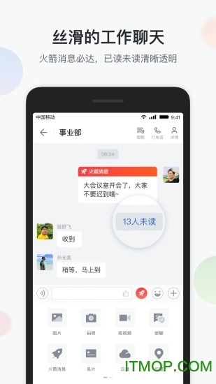 ? 丝滑高效的工作聊天:支持火箭消息、必达提醒、阅后即焚,重要信息3分钟未读自动短信补发,确保关键任务零遗漏;? 智能来电名片:通话前实时显示对方身份与部门信息,未闻其声,先知其人;? 全维度日程中枢:集成个人待办、团队会议、事项提醒与多级通知,日程自动同步、多重提醒、一键跳转;? 企业级应用聚合:开放平台支持自定义接入行业系统,打造单位专属工作台;? 疫情防控专项支持:上线“防疫专区”,整合实时疫情数据、健康打卡、同行查询、线索申报等刚需功能,政企抗疫有保障。