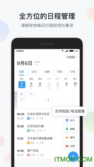 【通讯录】统一汇聚企业架构、内部同事、外部联系人,完整组织树+快捷搜索+短号管理,1秒定位任意成员;【日程】支持会议邀约、团队通知、事项提醒及多端同步,重要日程可设置前置提醒、重复周期与关联文档。全新的工作沟通方式