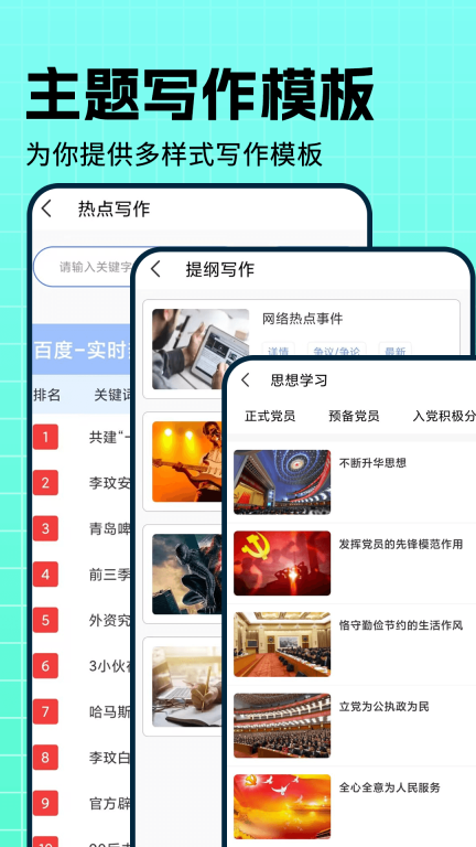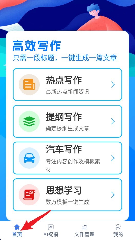 1、首页设有多种写作类型的入口,覆盖热点、提纲、汽车等不同场景,用户可一键生成高效内容。