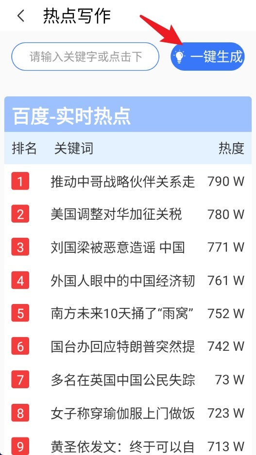 进入热点写作功能后,能够挑选热门关键词,点击“一键生成”按钮,从而快速得到时事文章的草稿。
