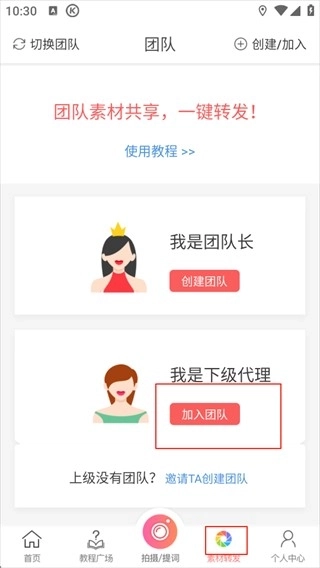 2、打开首页后,找到页面底部的【素材转发】按钮并点击,接着点击页面中间位置的【加入团队】选项。