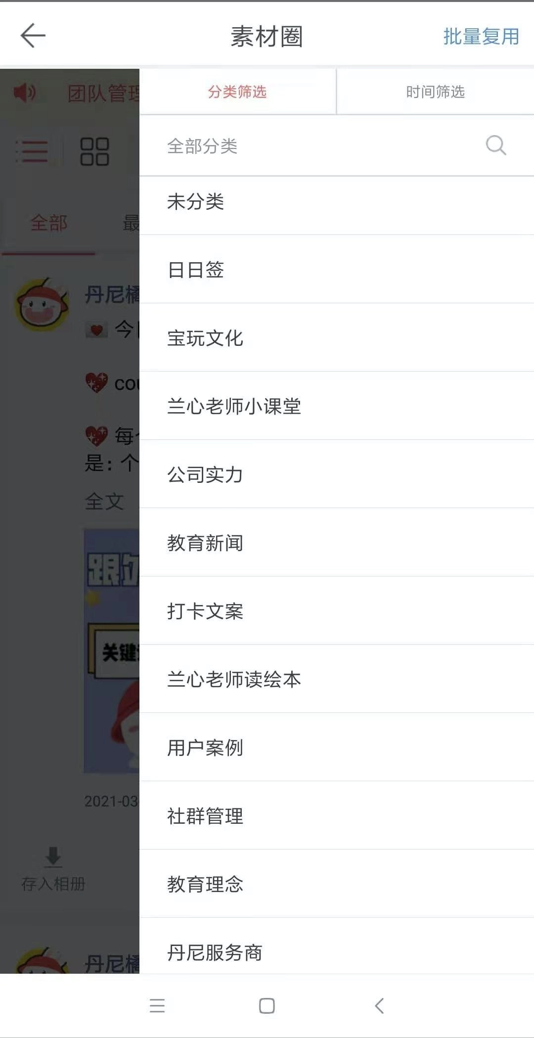 4、完成操作后,你就可以在团队的【素材圈】板块中,浏览到日日签、公司实力展示、用户案例分享等各类丰富的素材内容啦!