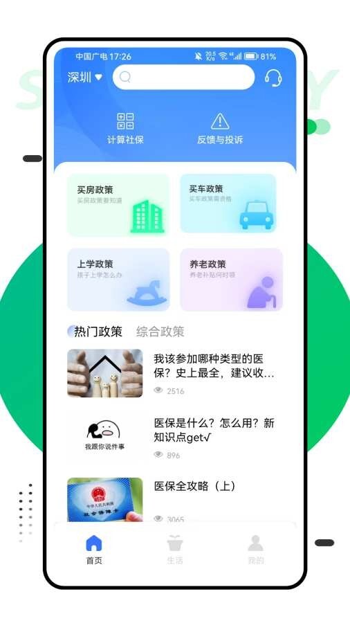 2、进入主页,会看到买房政策、买车政策、上学政策等功能模块,随时选择使用。