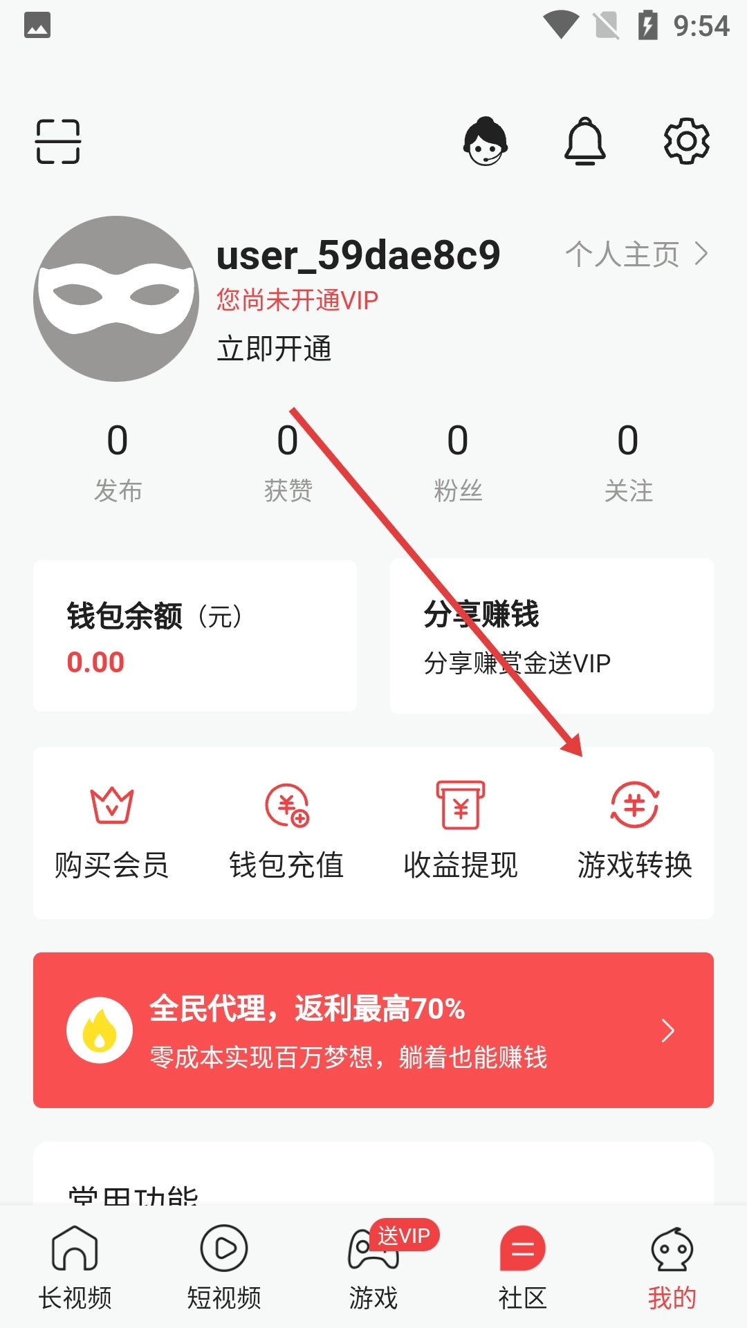 1、在【我的】页面,点击【游戏转换】选项,进入游戏转换页面。