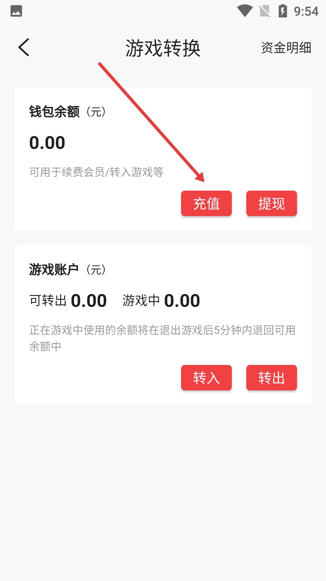 2、在游戏转换页面,点击【充值】按钮,进入充值页面。