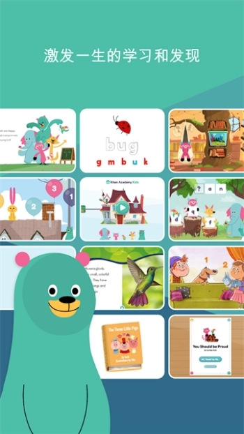 KhanKids安装器是一款专门面向儿童设计的线上学习教育软件,平台内不仅提供丰富多样的亲子游戏,让孩子能在玩乐中学习知识,还会定期开展各类手工活动,方便家长和宝宝共同参与,以此增进亲子间的互动交流。感兴趣的朋友们不妨来亲自体验一番!