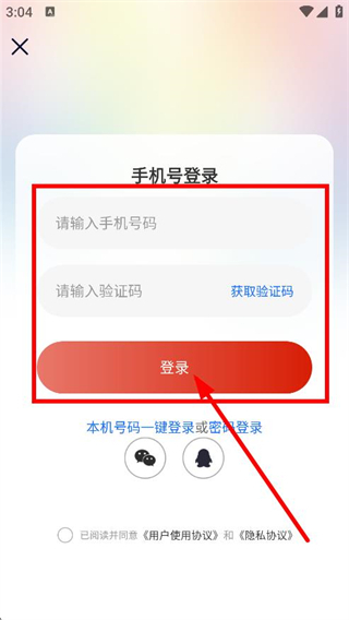 3、输入手机号码,点击“获取验证码”并输入收到的验证码,接着点击“登录”按钮,即可完成账号登录操作。