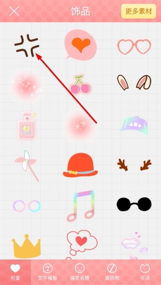 4、进入【饰品】素材页后,选择目标饰品(如十字形装饰),即可将其添加到图片上,丰富画面效果。