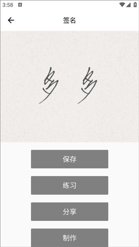 3、用户可随机打开已生成的字体签名样式,对该签名进行保存、练习或分享操作。