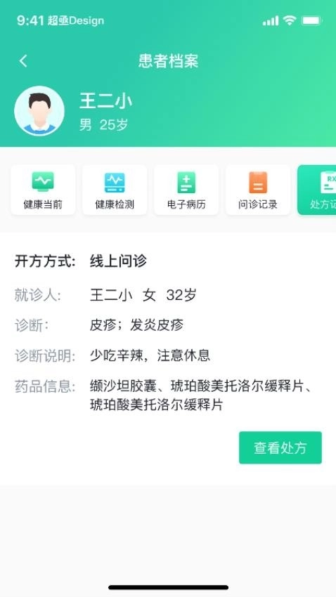 这段文本展示了患者的详细档案信息,通过在线方式即可查看患者的处方。