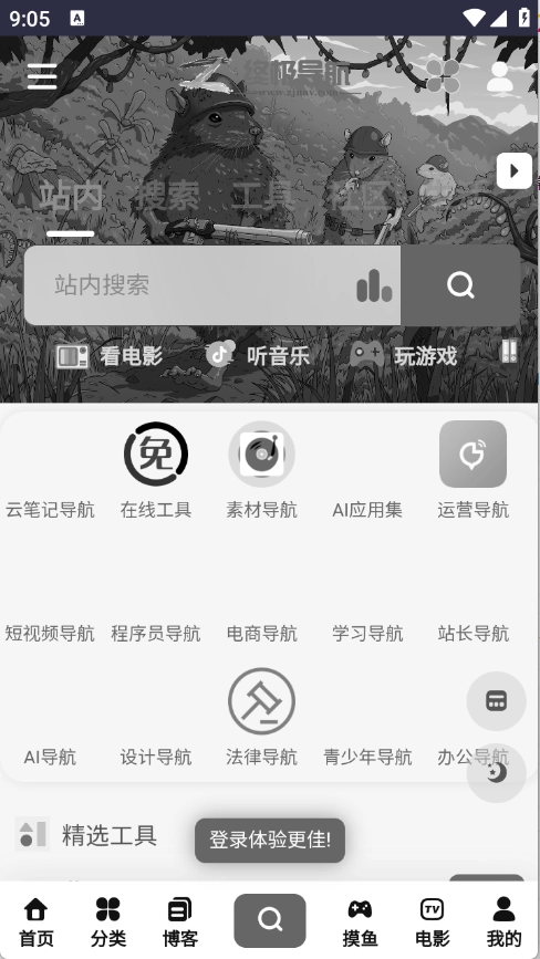 首页页面汇聚了各类在线工具,涵盖看电影、听音乐、玩游戏等多种类型。