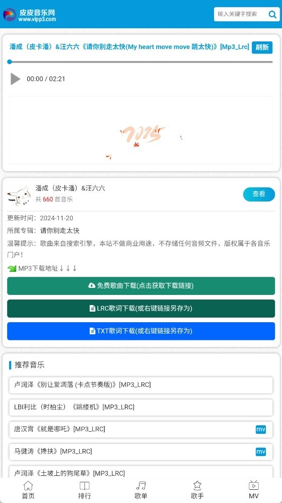 皮皮音乐网是一个拥有海量音乐资源的平台,这里汇聚了全网丰富的音乐歌曲作品。用户可以在动感十足的节奏音乐世界里开启挑战,各类音乐节奏都免费提供,让你轻松找到喜欢的音乐作品,享受更优质的听歌体验。平台会根据用户的喜好推荐相关音乐,并定制不同的电台歌单进行播放,音乐资源可轻松解锁体验。你可以找到心仪的音乐歌曲,按照不同的播放模式开启音乐之旅,畅听喜爱的歌曲,而且所有内容都免费播放,适合不同用户安装使用来聆听音乐。