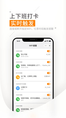 【WiFi提醒】你可以设置当连接或断开特定WiFi时,让米橙提醒你要完成的事项,这个功能特别适合上下班打卡之类的场景。