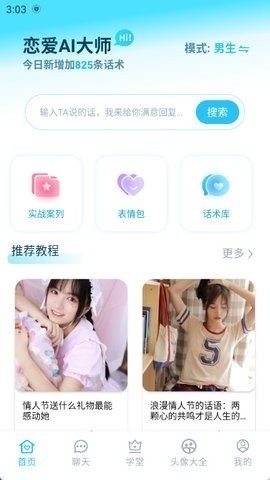 打开软件后,第一步是选择性别(男生或女生),进入首页就能看到平台推荐的教程、案例、实战经验、表情包和话术库等各类丰富资源。软件的核心亮点在于聊天功能,借助AI可以引导用户回复追求对象、女朋友或朋友,还能从可爱、温柔、道歉、正式等多种风格里挑选合适的话题性回复。