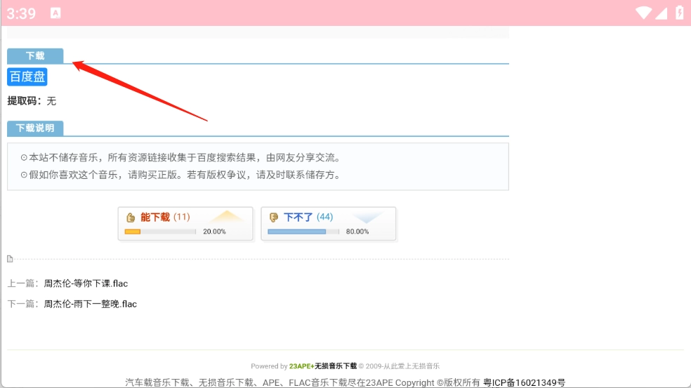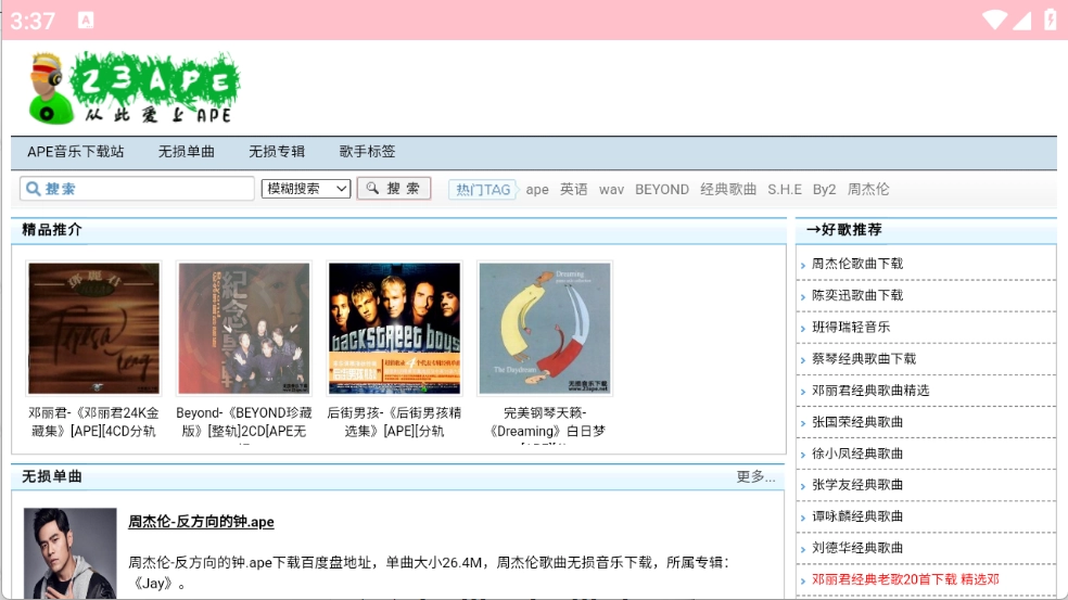 23APE音乐平台汇聚了海量音乐资源,支持关键词搜索功能,能帮助用户快速定位心仪的音乐作品。平台内所有音乐均免费提供,界面设计简洁直观,无论是经典老歌还是流行金曲等各类音乐,用户都能在这里轻松找到。