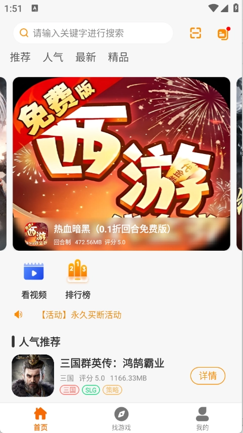 “找游戏”页面对游戏做了细致的分类,涵盖策略、仙侠、玄幻等多种游戏类型。