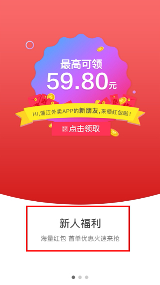 1、这是浙江外卖的新人引导页面,新用户可以领取最高59.80元的新人红包,还能参与“新人福利”板块里的海星红包、首单优惠等各类活动。