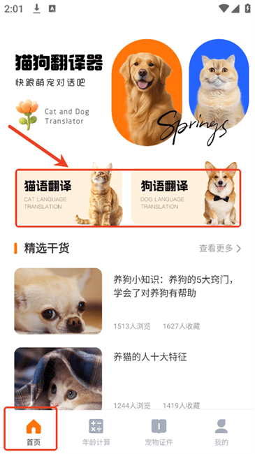 1.在【首页】点击“猫语翻译”或“狗语翻译”