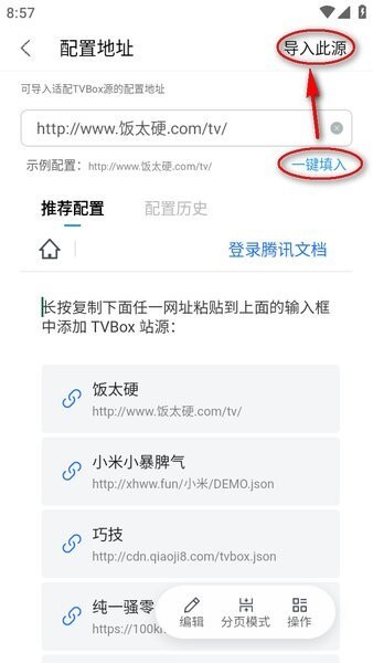 然后选择“点击添加”-“粘贴自定义站源”,把规则粘贴进去,再点击“导入”就可以了!