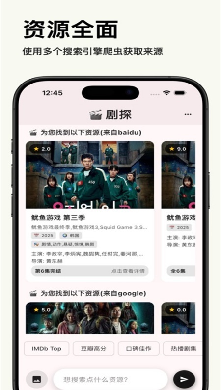 输入影片名称、演员姓名或者导演名字,AI就能帮您整合全网的相关资源,涵盖各大视频平台以及网盘资源。