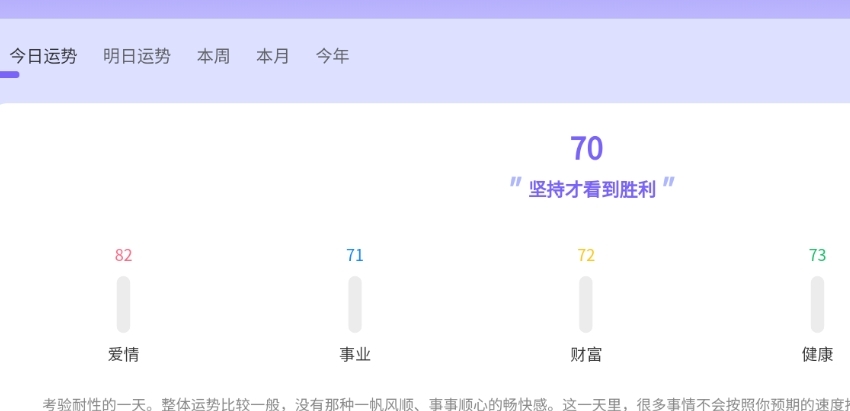 1、运势应用建议:除了对运势进行解读外,还会给出切实可用的运势应用方面的建议。例如,当事业运势处于不佳状态时,会为用户提供调整工作策略的具体建议。