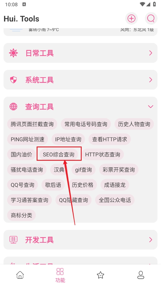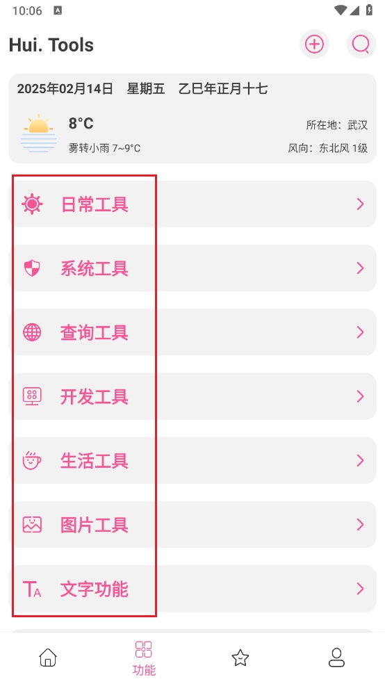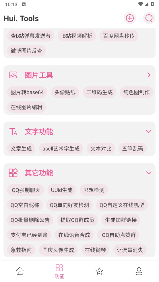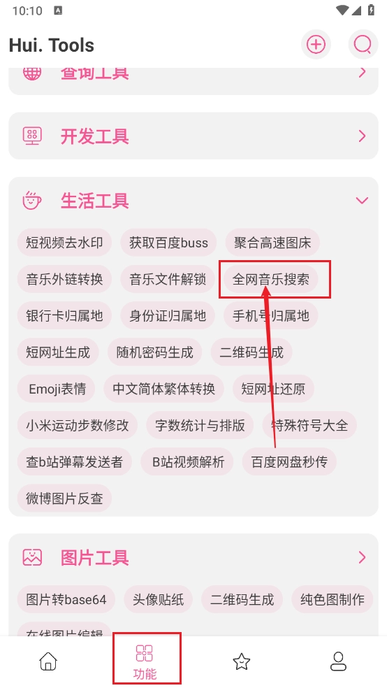 切换到“功能”页面,这里包含日常工具、系统工具、图片工具等各类资源。