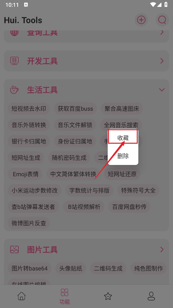 打开软件,进入"功能"板块,选择所需收藏的工具。