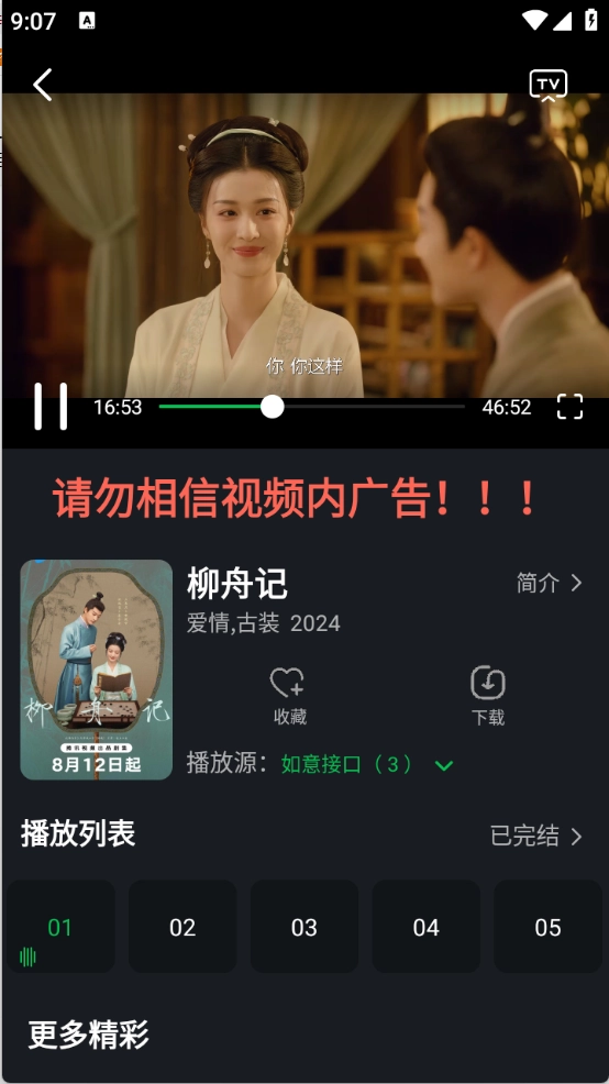 用户找到心仪的影视资源后,能够挑选集数、更换播放源,还可以使用投屏等功能。