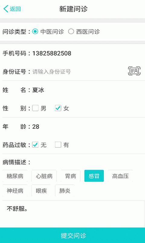 新建问诊十分简单,只需输入个人基本信息,描述清楚病情后点击提交,医生就会及时为您判断病情。