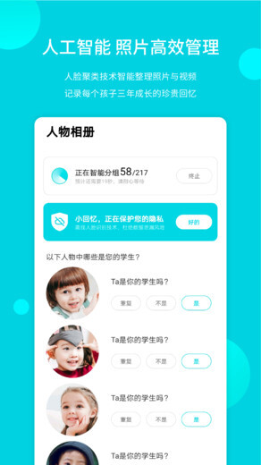 借助AI智能与人脸识别功能,能自动识别手机里的人脸照片,为每位人物创建专属的照片回忆集,帮助老师们节省在照片和视频整理上花费的时间。