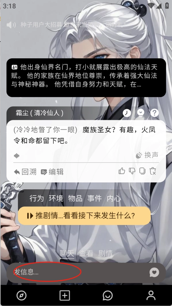 用户直接点击自己喜欢的虚拟人物,然后在输入框里输入文字发送,就能开启对话了。