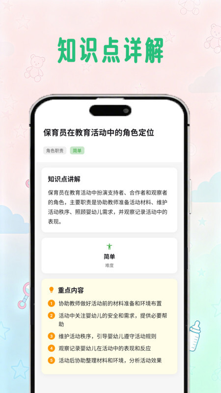 1、巧妙串联各知识点,将零散的保育员相关知识如同串珠子般串联整合,构建成完整的知识体系,助力你在学习单个知识点后,能够自然联想到与之相关的内容,从而进一步强化记忆效果。