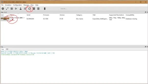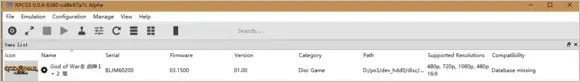 游戏已经放进PS3模拟器里了,接下来打开模拟器,先点击图里标注的1,这样列表中就会出现2战神游戏的图标。