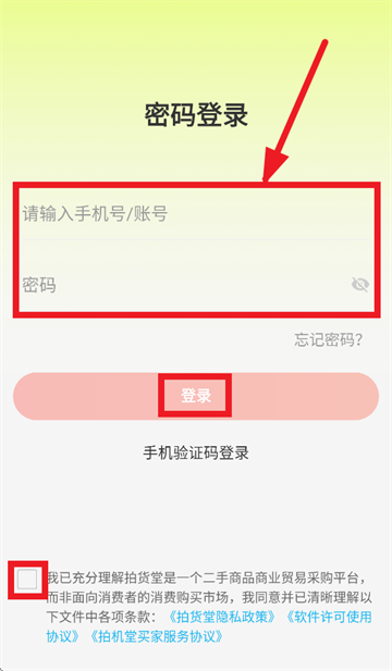 输入手机号或账号、密码,勾选“我已充分理解拍货堂是一个二手商品商业贸易采购平台,并非面向消费者的消费购买市场,我同意并清晰理解《拍货堂隐私政策》《软件许可使用协议》《拍机堂买家服务协议》中的各项条款”,点击登录按钮即可完成登录。