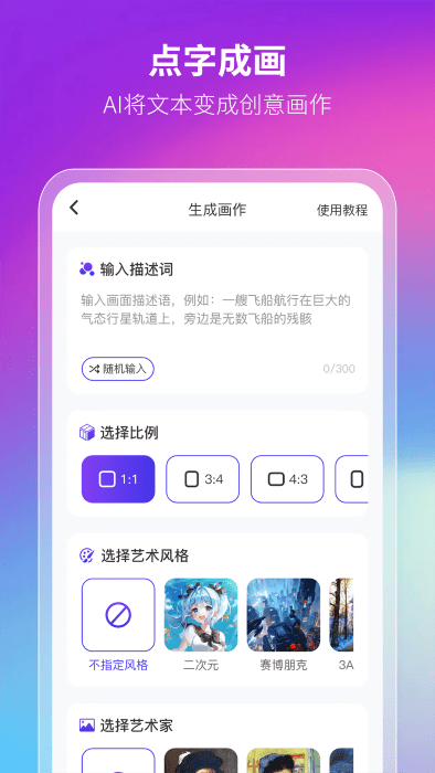 非凡AI画画是一款功能丰富的手机绘画应用,支持AI一键创作——只需给出想要的意境,就能生成精美的画作,还能自由挑选绘画风格。这款智能作图软件还能一键分享作品到社交平台,感兴趣的朋友快来体验吧!