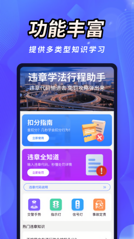 违章学法行程助手是一款手机线上教育平台,平台内提供专业的驾考知识内容,用户随时打开即可学习;同时,平台还为用户准备了海量题库,帮助用户掌握更多知识。多种学习模式有效提升了用户的学习水平与能力,系统配备的模拟测试功能能够检验学习成果、巩固所学知识,助力用户在考试中更好地发挥。