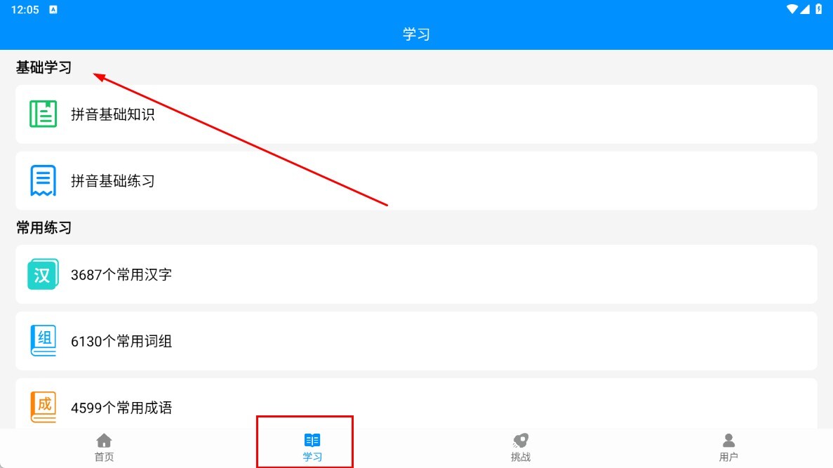 4、在学习页面,您可以选择【基础学习-分类板块】里的内容开展学习,例如拼音基础知识这类内容都能在这里找到并学习。