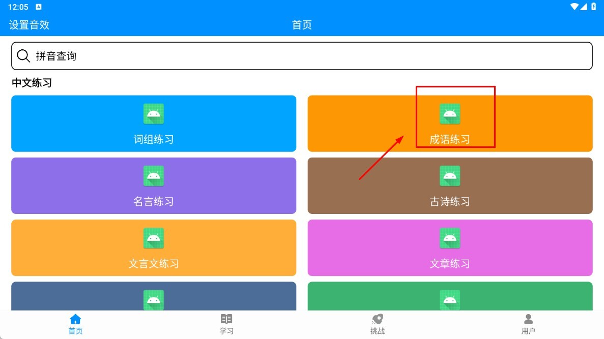 3、登录后回到首页,找到并点击【成语练习-功能板块】,即可进入对应的学习页面。