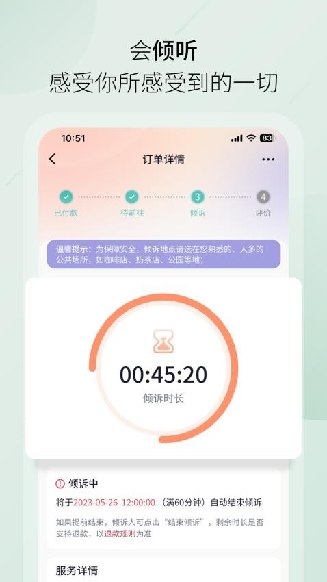 4. 通过历史记录功能,用户能够查看自己的倾诉记录与互动记录,便于后续的回顾与总结。