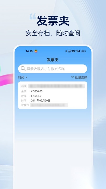 3、专属发票夹可安全存放各类票据,能依据收款方、付款方等关键词进行检索,历史发票可一键调出,相关细节清晰明了、便于查询。