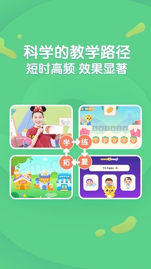 1.科学分阶教学体系:软件依据孩子的不同年龄段,规划了难度呈螺旋式逐步提升的教学内容,助力孩子轻松开启英文启蒙之旅。
