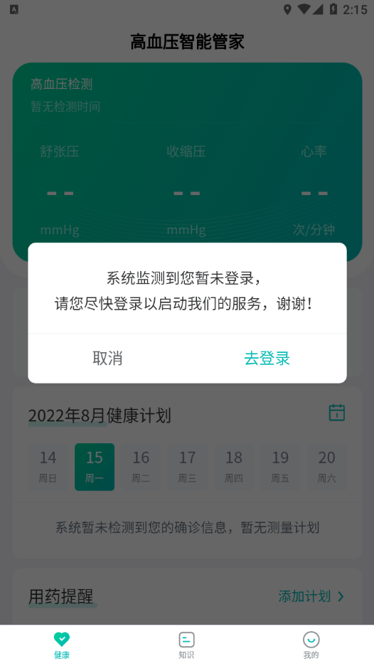2、健康计划:依据医生制定的个性化健康管理任务,通过智能提醒与记录用户的检测操作,助力患者在医生指导下开展自我血压管理。