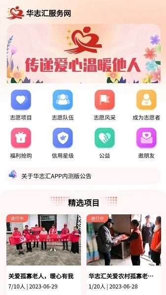 华志汇是一款专注于志愿者服务的平台。在这里,所有用户都能通过实名制完成注册登记,平台还搭建了在线交流互动的空间,方便大家沟通分享。平台会定期发布各类志愿者服务活动,面向所有用户开放参与机会;同时,用户也可以随时查看最新的志愿者服务新闻公告,平台还会精准记录每位用户参与志愿服务的时长。
