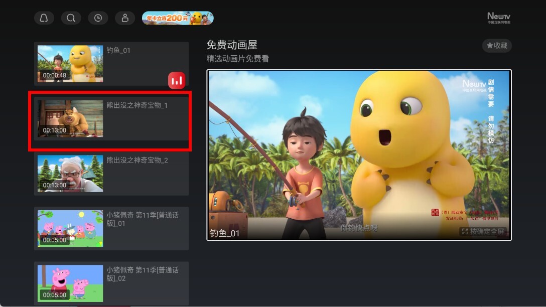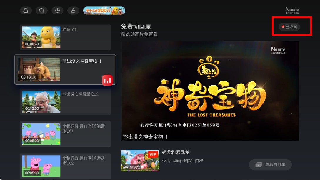 2、进入免费专区后,找到你感兴趣的动画内容,比如“熊出没之神奇宝物_1”,点击它就能进入对应的播放页面。