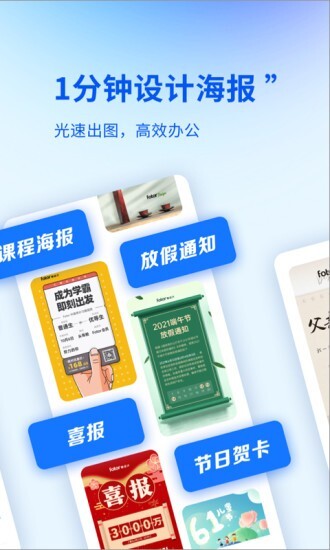 除了为广大用户提供轻便且全能的图片编辑工具外,Fotor懒设计的设计功能还可满足中小型创业公司、自媒体、学生团体及个体经营者的平面设计需求,借助专业设计师打造的模板,仅需几分钟就能轻松完成一系列具备专业水准的平面设计作品。